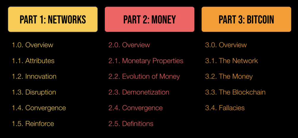So I'm going to arm you with analogies, mental models, and downloadable resources to do just this. We'll tackle bitcoin by first exploring the topic of networks, then the logic of money, before finally connecting these dots to bitcoin.